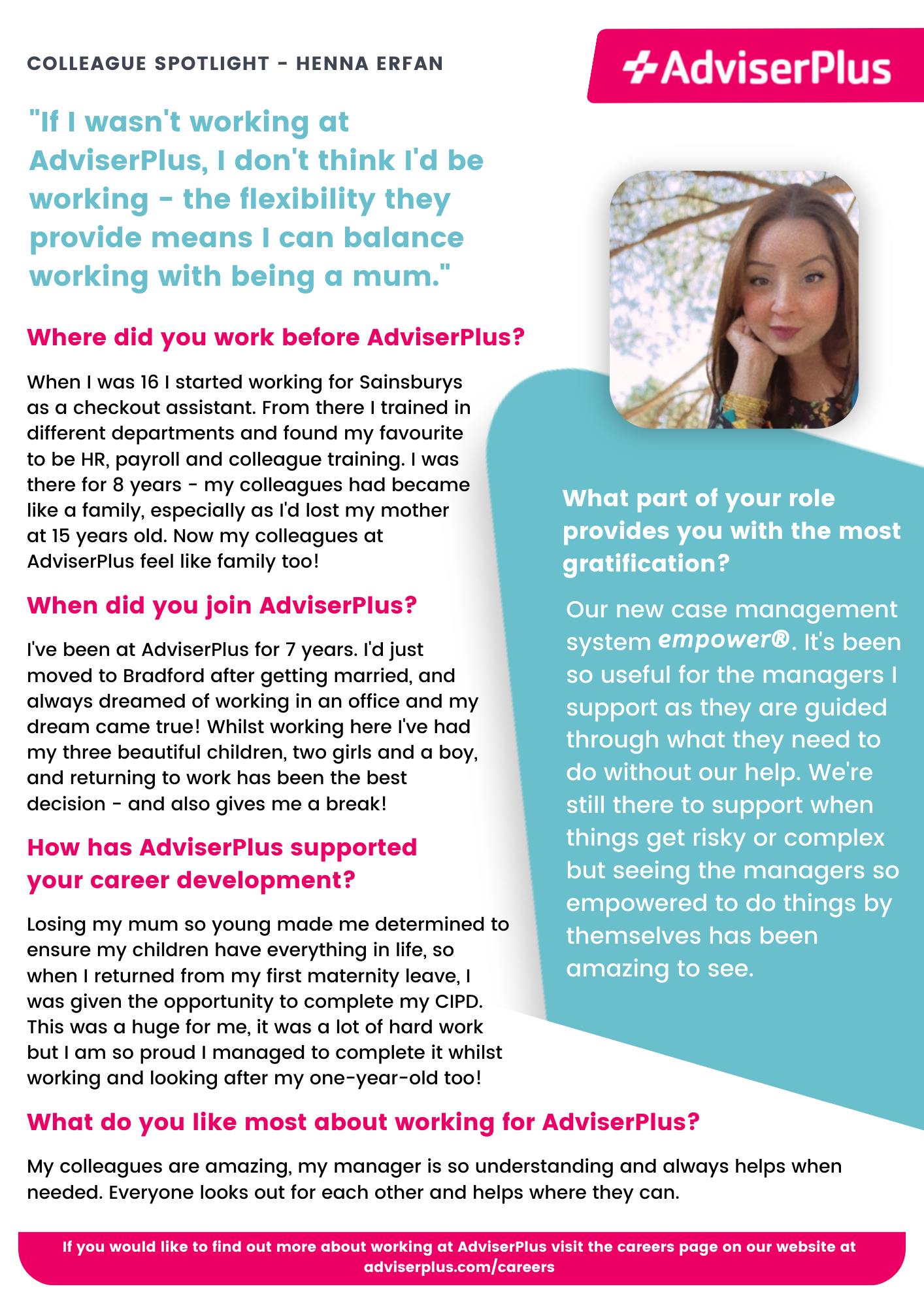 There are so many great career opportunities at AdviserPlus and, as Henna’s story proves, we’re really committed to giving our colleagues the opportunity to not only develop themselves but to work according to their needs.